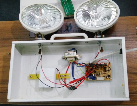 There are three indicators on the front panel: fault indicator, charging indicator and main power indicator, as well as an experimental touch switch button, the role of the button is to simulate the power failure when pressed in the case of main power, check whether the emergency lamp lighting function is normal. When the power is connected, the fault light is normally off, but now the three indicators are on, which indicates that the internal circuit is faulty and cannot be used normally, and further maintenance is required.